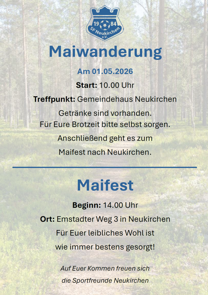 Am 1. Mai 2026 findet wieder unsere traditionelle Maiwanderung mit anschließendem Maifest statt. Wir freuen uns wie immer über zahlreiche Teilnehmer!